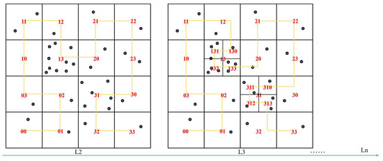 A space-filling curve is a one-dimensional continuous curve that can run through multi-dimensional space, and it represents an effective method of dimensionality reduction that is widely used in various types of GIS algorithms [40]. Commonly used space filling curves include the Z curve and Hilbert curve [41]. The Z curve has local proximity, although it also has serious spatial mutability, i.e., the points coded by neighboring numbers may not be adjacent to each other, and its coding cannot effectively reflect spatial distance [42]. The Hilbert curve has optimal spatial aggregation and discrete approximation abilities, and adjacent points in space are adjacent and continuous on the curve; thus, it can realize the mapping from multidimensional space to one-dimensional space well [40,43]. Therefore, the Hilbert curve is chosen as the basis of the coding algorithm in this study and realizes the adaptive grading of discrete data by setting the following threshold: higher-order Hilbert curves are generated in regions with dense 3D points, and lower-order Hilbert curves are generated in regions with sparse 3D points. The underlying coding algorithm for Hilbert curves is available on GitHub [44]. To clearly describe the process of spatial adaptive segmentation, a two-dimensional example is provided in Figure 2. The subsequent plots in this paper are likewise provided in two dimensions.