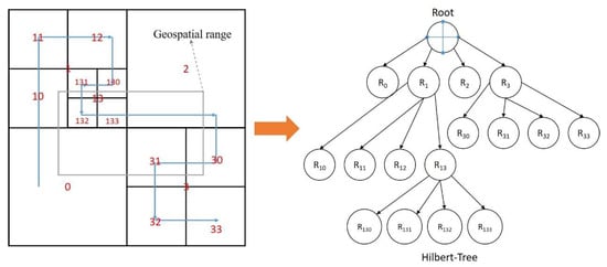 Spatially adaptive partitioning is used as the basis for constructing the Hilbert tree, which enables the construction of the global index (Figure 3). The unique corresponding Hilbert code of the point cloud partition indicates its position in the Hilbert tree in the storage system. Additionally, to avoid redundant coding calculations and grid space, we optimized the index structure of the Hilbert tree and proposed a compact Hilbert tree. For the eight leaf nodes obtained from the subdivision, the leaf nodes that do not contain data are chosen to be eliminated from the index tree and the minimum bounding box that can contain them is obtained by re-computing according to the remaining leaf nodes to complete the reconstruction of the parent node.
