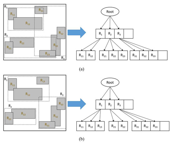 Comparison of R-tree and R*-tree. (a) R-tree and (b) R*-tree.