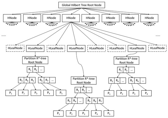 The global index is designed to index all partitions and their physical locations to obtain a global overview of the point cloud partitions in the storage system. Since the global index resides in the memory of a single node, it should take up as little memory space as possible and be easily implemented. Therefore, the Hilbert tree with its leaf nodes only holds the Hilbert-encoded information of the corresponding grid, indicating its position in the storage system with the Hilbert tree, and does not actually store the point cloud data.