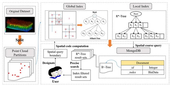In this paper, by refining the spatial units, the dense spatial point cloud data are divided into relatively small groups to participate in the point cloud hierarchical index construction, and a spatial index framework for large-scale point cloud data oriented to NoSQL is designed based on the hierarchical index structure (see Figure 7). The main idea is to organize the point cloud by spatial encoding via R*-tree and accelerate point cloud spatial query processing via one-dimensional B+-tree. The spatial query uses the classical two-stage processing strategy. The index screening stage is based on the global Hilbert tree for rough querying, according to which the R*-tree of the corresponding partition is obtained for precise query to obtain the final result.