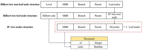 For the Hilbert tree leaf nodes in which the actual data are stored, the local index R*-tree is stored in the collection and the documents within the collection store the ROWID number of the root node of the R*-tree and its node information. The ROWID of the root node is the unique identifier of the root node document, and it is used to read the root node data from the database as well as the data for any node in the R*-tree. In this study, Hilbert encoding is chosen as the ROWID of each document in MongoDB, which represents an important foundation for MongoDB to realize distributed storage. To facilitate point cloud spatial querying, this study constructs a B+-tree index on the ROWID field and ensures that the nodes of a single R*-tree that uniquely correspond to the grid Hilbert encoding are also deposited into the same set as the elements of the document. Moreover, the nodes are divided into leaf and non-leaf nodes, which have different structures. For storage convenience, this study serializes the node data of the R*-tree as binary blocks, that is, BinData type elements deposited into the document. Among them, the leaf nodes record the attribute information of the point cloud, the non-leaf nodes store the corresponding minimum bounding boxes and pointers to child nodes, and access to non-leaf nodes reveals whether the child nodes satisfy the coarse check requirements.