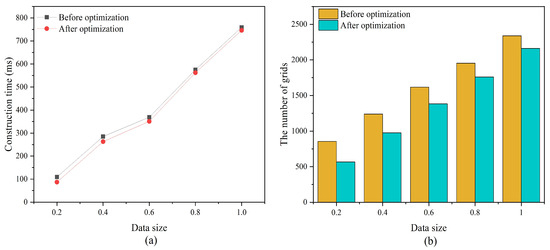 Hilbert tree construction time and the number of partitions before and after optimization. (a) Construction time comparison and (b) number of partitions comparison.
