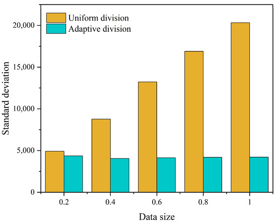 We compare the data load balancing between the two cases of uniform division and adaptive division based on 3D space. The order of uniform division is 4; the minimum order of adaptive division is 3, and the maximum order is 10. The experimental results are shown in Figure 11. The adaptive spatial division result corresponds to a smaller σ value, and the discrete degree of the number of 3D point objects contained in each grid is lower. This indicates that adaptive spatial division can alleviate the data skew to some extent and balance the amount of data in each grid space.