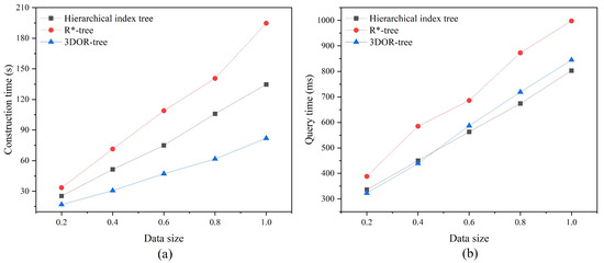 Moreover, we selected the two index structures R*-tree and 3DOR-tree [31] with hierarchical index trees for index construction and query performance testing. The selection of the dataset and the setting of the query range were the same as those used in the previous experiment. Among them, the node splitting thresholds of R*-tree and R-tree in the 3DOR-tree were both (8, 16); the node splitting thresholds and depths of Octree in the 3DOR-tree and Hilbert tree in the hierarchical indexing tree were both 20,000 and 10, respectively; and the initial division order of the Hilbert tree was 3. The experimental results are shown in Figure 13.