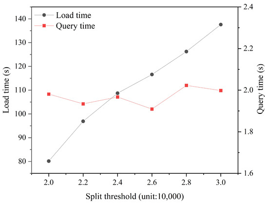 From Figure 14, it is observed that the lower the threshold of spatial adaptive splitting, the shorter the data insertion time, mainly due to the fact that the 3D space undergoes an increased number of splits, which results in the growth of the number of R*-trees, but the size of a single R*-tree decreases, and the time to serialize it into binary blocks is shortened. Meanwhile, observe also that the threshold of spatial adaptive splitting has little effect on the query elapsed time. The reason for this is that, when the sample data are constant, the query time is mainly determined by the size of the query result set.