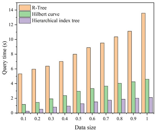 For the hierarchical index tree and 3DOR-tree, both had higher index construction and query efficiency and reduced the complexity of index construction through a two-level nested index structure. Moreover, they pruned the query space to provide efficient data query support. In terms of index construction, the construction of a hierarchical index tree takes more time, mainly because the construction of a Hilbert tree is slightly more complex than that of an Octree, in which the space of child nodes must be encoded and calculated, while the index structure is optimized. Secondly, the second level index selection of the hierarchical index tree and 3DOR tree are R* tree and R tree, respectively, and the maintenance and update of R* tree is more time-consuming than R tree. In terms of spatial query, due to the optimization of the Hilbert tree, the space of nodes and search paths that need to be re-solved are reduced and the query efficiency is improved. The reconstructed nodes can more accurately filter the partitioned R* trees that satisfy the query conditions, thus reducing the size of subqueries and further improving the query efficiency. In addition, the query efficiency of R*-tree is higher than that of R tree, and with the increase in query data volume, the advantage of R*-tree is more obviously demonstrated.