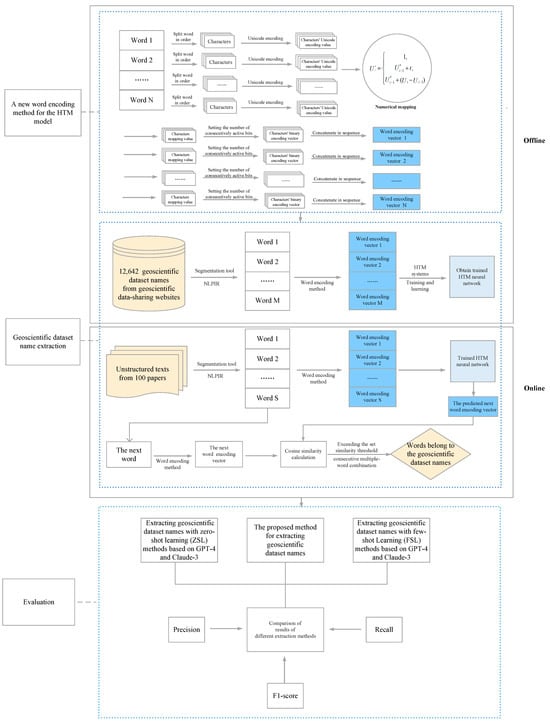 To address these problems, this study proposes a method for extracting geoscientific dataset names based on the hierarchical temporal memory (HTM) model. The HTM model is a brain-inspired artificial neural network [,] that has excellent abilities in high-level cognitive activities, such as language understanding, spatial cognition, and navigation []. The elements of dataset names are encoded into binary vectors by our proposed new encoding method. The sequence of binary vectors of a dataset name is input to train the HTM model and make it understand the naming rule. We then use the trained HTM model to recognize the names of geoscientific datasets from text in the literature. Compared with existing methods such as GPT-4 and Claude-3, the results show that our method has a higher F1-score.