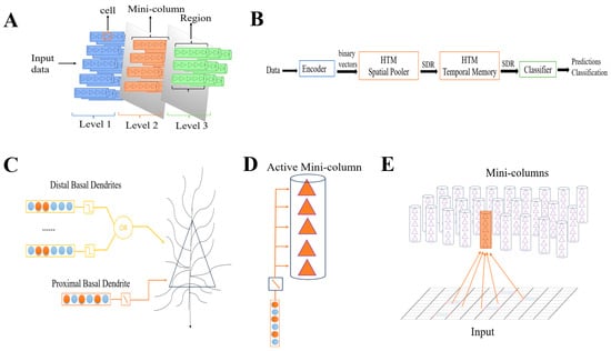 HTM structure [,]. (A) HTM has a three-level hierarchy. The smallest unit is an HTM cell. In each layer, there are a large number of cells, multiple cells form mini-columns, and multiple mini-columns form regions. (B) The end-to-end HTM system includes an encoder, HTM SP, HTM TM, and a classifier. (C) An HTM neuron has one proximal dendrite and several distal dendrites, and dendrites have different functions. Proximal dendrites receive feedforward inputs, while distal dendrites receive contextual information from nearby cells in the layer. (D) All cells in the same mini-column share the same synapses that receive feedforward inputs, which means they receive the same information. (E) Each layer of the HTM model consists of several mini-columns of cells that can read and form synaptic connections with input data.