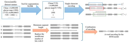 Secondly, we use the NLPIR tool to segment the names of geoscientific datasets into word sets (the maximum number of characters in the word is set) []. For every word, the Unicode value of each character contained in it is obtained and converted by using Formula (1). The following steps are used to encode words: (1) For all , the minimum  is , the maximum is denoted as , and the range is [, ]. (2) We create  buckets to split the character encoder values. (3) We choose the number of consecutive active bits  in each representation and compute the total number of bits  of the encoded character: . For each character and its , the encoded representation is created by setting  unset bits with  consecutive active bits starting at index . (4) All encodings of characters in the word are combined in order. Words that do not reach the maximum length are encoded as empty with zeros to ensure that all words have the same number of bits in their encoding. An example of encoding the names of geoscientific datasets is shown in Figure 3.
