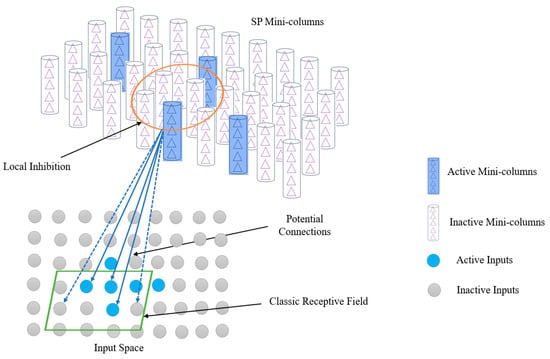 The spatial pooler (SP) algorithm consists of three steps: the formation of classic receptive field (for example, the dashed green rectangle in Figure 4), the activation of mini-columns, and the learning of proximal synapse permanence. The classic receptive field formation stage determines the key parameters of the HTM model and establishes potential connections between the input data and the synapses of the proximal dendrites of mini-column . The potential connection between mini-column  and the input data can be denoted as
