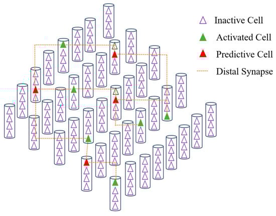 Structure of HTM temporal memory [,]. Cells in the TM process can exist in three states: inactive, active, or predictive. When a cell does not receive any feedforward input, it is in an inactive state (purple triangle), and when it receives feedforward input, it is in an active state (green triangle). Sufficient lateral activity in a contextual dendrite leads to a predictive state (red triangle).