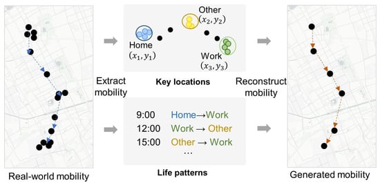 Despite the ease of collecting large-scale individual mobility positioning data facilitated by modern Information and Communication Technology (ICT) developments, the availability and usability of raw mobility data, which often involve personal privacy and contain redundancy, missing values, and noise, remain considerably limited [7]. Real-world human mobility data contain sensitive information, such as individuals’ workplaces, home addresses, and even hospital visit records, which hinders their widespread use. Therefore, it is necessary to develop a practical technique that addresses these privacy issues while releasing mobility datasets. Additionally, large-scale mobility data are often difficult to obtain. By generating synthetic mobility data, we can acquire extensive urban mobility data, providing a crucial foundation for urban planning and management. Recent research found that synthetic data could be better than real data, as real data come with issues beyond privacy considerations, such as being expensive to produce and maintain, emphasizing the potential of machine-generated datasets in protecting privacy and addressing data skewness [8]. It advocates for the acceptance and embrace of data generation technologies and their implications by researchers and the public.