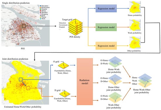 Single distribution probability generation: A regression method is used to estimate the single distribution probability of being at home, work, or other. By analyzing basic data such as the POI and thermal data in city grids, the distribution of home, work, and other locations is estimated through a regression model.