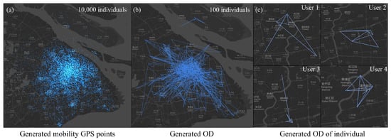 - By testing the representatives of the generated mobility data, we found that using only about 0.25% of the generated individuals’ mobility is sufficient to represent the dynamic changes of the entire urban population in daily and hourly resolution, at a 1 km × 1 km grid level, compared to real-world mobility datasets.