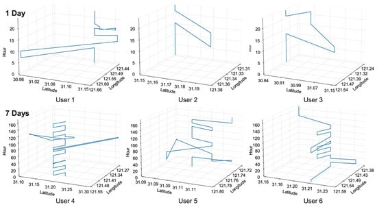 For the research, anonymous data from mobile phone data from Shanghai and Beijing were used for testing. The mobile signaling data used in this study were obtained from mobile operators and originally gathered for billing and operational purposes. The Shanghai dataset comprises information from over 27 million users with a daily volume of approximately 80 million records, covering the period from 13 to 19 November 2023. From these 27 million users, we randomly selected two groups of 30,000 regular users (those who stayed more than two-thirds of the days in a month) for comparative validation in our results. The Beijing dataset includes data of similar quality from November 2023. Each data record includes various information, such as an encrypted user ID number, the timestamp of the signal event, and the user’s location coordinates. The user’s location coordinates were obtained from the latitude and longitude of the nearest connected base station to the user.