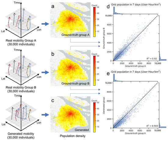 Figure 7a–c display the population density calculated from real data group A (Figure 7a), real data group B (Figure 7b), and the generated data group (Figure 7c), respectively. Figure 7d compares ground-truth group A with ground-truth group B, showing a value of 0.92. The scatterplot in Figure 7e illustrates the comparison of 24 h grid heatmaps between the generated group and ground-truth group A, with each point representing the population count of a grid at a specific time. The general high correlation ( = 0.905) indicates a strong similarity between the generated and ground-truth data. The distribution of points suggests that the population heatmap generated by our model closely mirrors the actual population, demonstrating the effectiveness of our approach in replicating real-world population distributions within urban grids.