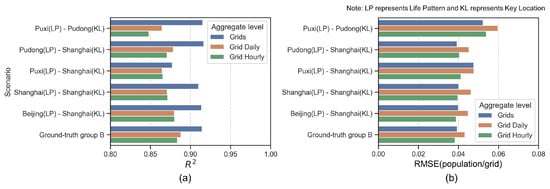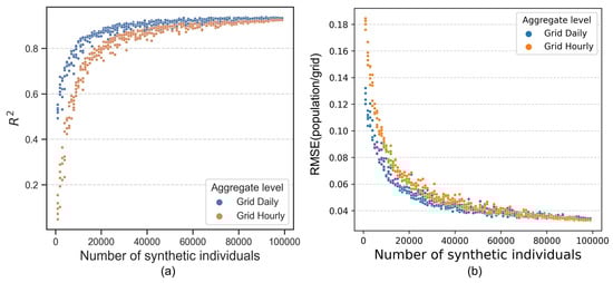 Figure 9 illustrates the relationship between the number of synthetic individuals and its representative performance described by two statistical metrics of (Figure 9a) and RMSE (Figure 9b) compared to the density of the real population. Illustrated in both figures, as the number of synthetic individuals increases, the aggregated daily and hourly results show a tendency to stabilize, with the daily performance generally exceeding that of the hourly performance. When the results of the virtual individual generated reach around 10,000, the generated mobility can describe the population dynamics at the city level with an of over 0.8 for daily granularity and requires over 20,000 individuals for hourly granularity. In fact, this result also demonstrates that the use of only about 0.25% of the sampled individuals (20,000 out of 8.08 million) is sufficient to represent the dynamic changes of the entire urban population, further proving the value of mobility generation technology in this study.