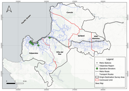 This study focuses on the Metropolitan Area of Valparaíso (Also known as Greater or Gran Valparaíso), specifically on the EFE Valparaíso metro network present in this area, which covers the cities of Valparaíso, Viña del Mar, Concón, Quilpué, and Villa Alemana, with a population of 951,311 inhabitants [61]. In terms of population, it is relevant to highlight that there are slightly higher numbers of women than men in these cities. Furthermore, Viña del Mar is the most populated municipality, with 334,248 inhabitants, while Concón registers the smallest population, with 42,152 inhabitants, as detailed in Table 4.