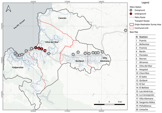 According to Aprigliano et al. [22], there is a need to advance mobility studies, which are applied to small and intermediate cities. The authors state that most studies within the Latin American context are focused on large cities. In Chile, this is not different; most mobility and transport studies are dedicated to Santiago and Concepción, both having the largest metropolitan areas in this country. Regarding Valparaíso, it is the third-largest metropolitan area in Chile, with approximately 1 million inhabitants, and composed of five cities: Villa Alemana, Quilpué, Concon, Viña del Mar, and Valparaíso. Respectively, they have 126,548 (13% of the population of Greater Valparaíso), 151,708 (16%), 42,152 (4%), 334,248 (35%), and 296,655 (31%) inhabitants. The metro system comprises one line with 43 km and 20 stations. Furthermore, four of the cities in the study area have metro stations, which can be observed in Figure 1.