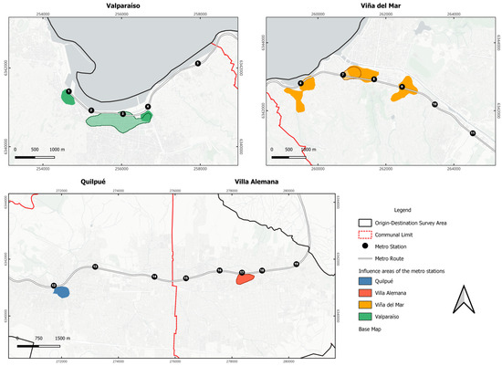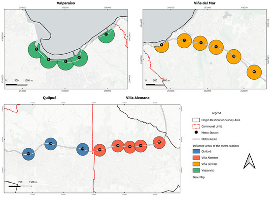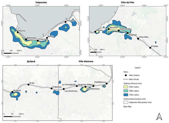 Areas of influence of metro stations in Greater Valparaíso with a radius of 400 meters. Observation: the names on the top of each part of the figure refer to the city on the map. Source: elaborated by authors.