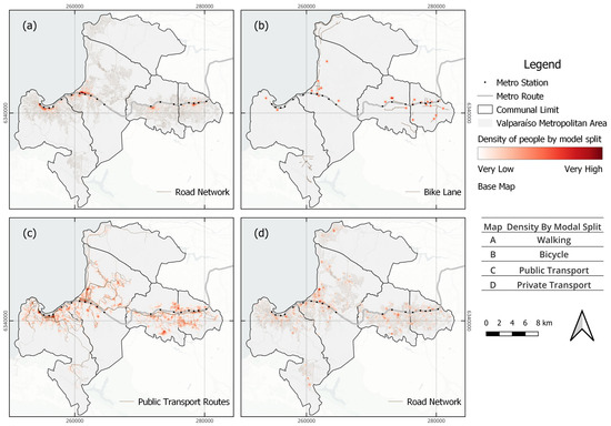 Density of origin of people who go to an area of influence of 250 m from the metro stations of Greater Valparaíso by modal choice: (a) Walking; (b) Bicycle; (c) Public transport; (d) Private transport. Source: elaborated by authors.