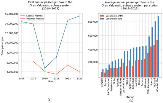 (a) Annual metro passenger flow between the years 2018 and 2023 for the Greater Valparaíso area that covers the metro network. (b) Average annual flow in the metro stations of Greater Valparaíso for work and holiday months. Source: elaborated by authors.