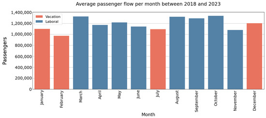 Average passenger flow per month between 2018 and 2023, categorized by work and holiday months. Source: elaborated by authors.