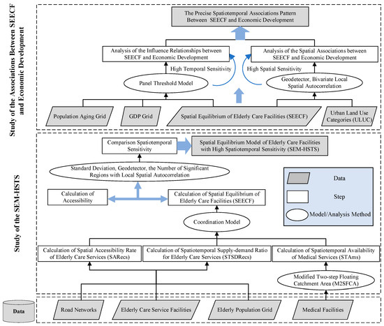 Achieving spatial balance in elderly care facilities necessitates a comprehensive matching between the quantity and quality of elderly care service resources and the demands of the elderly population. Elderly individuals exhibit a high sensitivity to travel distance, with inconvenience and distance being primary factors affecting their access to elderly care services and medical services. The spatial equilibrium of elderly care facilities (SEECF) is an index to quantify the balance of supply and demand distribution of elderly care facilities. Accordingly, this study proposed the construction of three factors at a 100-m grid scale, i.e., SARecs, STSDRecs, and STAms. These factors were integrated with a coordination degree model to calculate the SEECF. By comparing the SEECF with accessibility using three indicators—standard deviation, q-value of Geodetector, and the number of significant regions of local spatial autocorrelation—this study established SEM-HSTS. Secondly, leveraging the advantages of high temporal sensitivity, we employed a panel threshold model to investigate the phased influence of SEECF on economic development in the context of population aging. Lastly, based on the characteristics of high spatial sensitivity of SEM-HSTS and Geodetector, we analyzed the spatial associations between the SEECF and economic development under different ULUC, thereby obtaining precise spatiotemporal associations of the SEECF and economic development. The overall technical process is illustrated in Figure 1. It is divided into two main components, i.e., study of the SEM-HSTS and study of the associations between the SEECF and economic development.