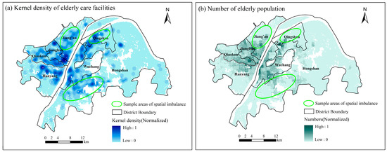While the overall findings align with existing research [16,40,42,80,81] and accessibility experiments, there were also divergent results. Taking 2020 as an example, regions marked with green circles in Figure 3c indicated spatial imbalance of SEECF, whereas strong accessibility in Figure 3f implied spatial balance. Further analysis, incorporating elderly care facilities kernel density and elderly population distribution (Figure 4), revealed these areas exhibited an abundance supply of beds but relatively low elderly population numbers, indicative of spatial imbalance resulting from resource inefficiency. Consequently, it preliminarily revealed that the spatial distribution of SEECF proposed in this study was more complex, with significant differences extending beyond the relatively vague phenomena observed at the village and street levels. This advantage stemmed not only from the analysis at the high spatial resolution but also from the careful consideration of the following three factors proposed in this study: SARecs, STSDRecs, and STAms, which accounted for the attenuation of service capacity of elderly care facilities at different scales and the actual needs of the elderly population, thus demonstrating high spatial sensitivity. Based on these findings, precise spatial planning and optimization of existing space for elderly care facilities can be supported with robust geographical information.