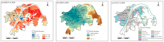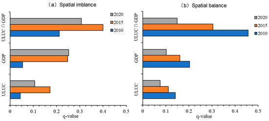 The analysis of the spatial association between the SEECF and GDP, based on bivariate local spatial autocorrelation, only examined the degree of clustering association. However, ULUC also played a significant role in the spatial association analysis of both variables. The high spatial sensitivity of the SEM-HSTS provided an excellent prerequisite for studying spatial associations under different ULUC. Geodetector, a spatial analysis method for detecting spatial stratified heterogeneity, is widely used for factor analysis. The Geodetector includes the following four detectors: (1) Differentiation and risk factor detection, the detection of the spatial differentiation of Y, and the extent to which the detection of a factor X explains the spatial differentiation of attribute Y. (2) Interaction detection, which identifies the interaction between different risk factors, i.e., assesses whether factors X1 and X2 increase or decrease the explanatory power of the dependent variable Y when they work together, or whether the effects of these factors on Y are independent of each other. (3) Risk zone detection, which is used to determine whether there is a significant difference in the mean value of attributes between the two sub-regions. (4) Ecological detection, which is used to compare whether there is a significant difference in the effects of two factors X1 and X2 on the spatial distribution of attribute Y. This study primarily utilizes the risk factor detector to explore the spatial stratified heterogeneity of the SEECF and to investigate to what extent GDP and ULUC factors explain the spatial stratified heterogeneity of the SEECF. It assessed the degree of spatial stratified heterogeneity by calculating the q-value of the dependent variable (SEECF). Furthermore, by separately calculating and comparing the q-values of individual factors and the q-value after the combination of two factors, it could determine the presence of interaction between the two factors, as well as the strength, direction, linearity, or non-linearity of the interaction [74]. The expression is as follows: