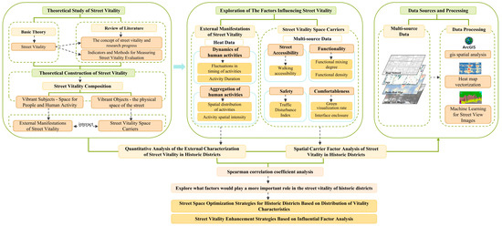 Based on the above limitations, this study takes the streets of Xi’an’s historic and cultural districts as the unit of analysis, and the research framework is shown in Figure 1.