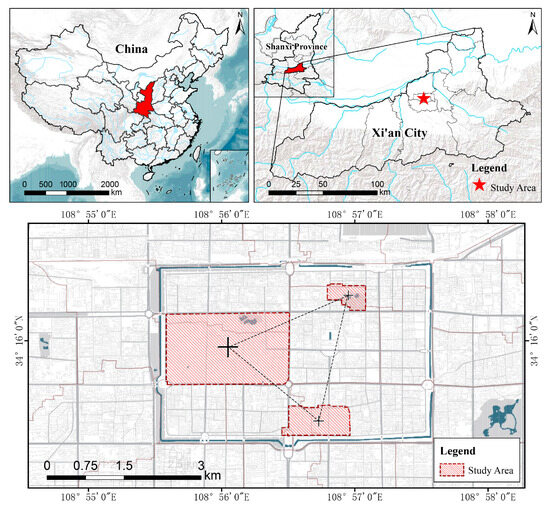 The Beiyuanmen Historic and Cultural District was formed during the Ming Dynasty and is located in the core of the ancient city of Xi’an, adjacent to the bell tower in the city center, and is the main area of the Muslim population in Xi’an. Its core protection area has a planned land area of 73.4 hm2, and the construction control zone has a planned land area of 224 hm2. The Sanxuejie Historic District is located in the area from the south gate of the Ming City Wall to the Wenchang Gate and is famous for its culture, with a planned land area of 33.8 hm2 for the core protection area and 50.2 hm2 for the construction control zone. The Qixianzhuang Historic and Cultural District is located in the northeastern corner of the Ming City Wall, which is a model of the residential area in the Republic of China, with approximately 1.6 hm2 of planned land for the core protection zone and 19.9 hm2 for the construction control zone. At present, these three districts are mainly for residential functions, supplemented by tourism and commerce, which not only continue the lifestyle and business style of the traditional residents of Xi’an but also carry out multiple functions, such as administration, culture, tourism, residence, and commerce. They represent historic areas with multiple functions, as well as meeting points for citizens’ lives, urban memory, and historic and cultural lineage.