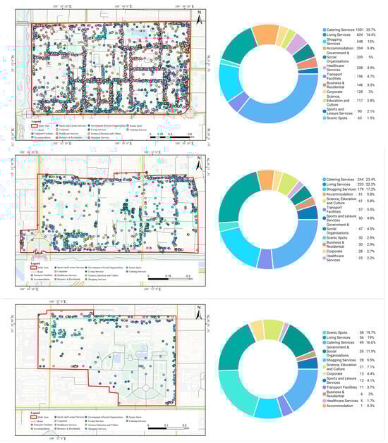POI data: Points of interest (POIs) encapsulate spatial information and have proven pivotal in urban spatial function analysis, reflecting human activity within urban spaces [74]. For this research, we acquired POI data from three historic cultural districts in Xi’an for 2024 using the Amap API, visualizing them with the ArcGIS Add XY Data tool. After refining Gaode Maps’ original POI categories to exclude those irrelevant to street vitality, we retained 12 categories comprising 5541 records. These included food and beverage services (32.3%), transportation facilities (4.8%), shopping services (13.6%), scenic spots (2.7%), lifestyle services (16.1%), accommodation services (8.2%), companies (3%), educational and cultural services (3.6%), healthcare services (4.3%), government and social organizations (5.3%), commercial and residential areas (3.3%), and sports and leisure services (2.7%). Figure 3 illustrates the distribution and proportions of these POI categories across the districts.