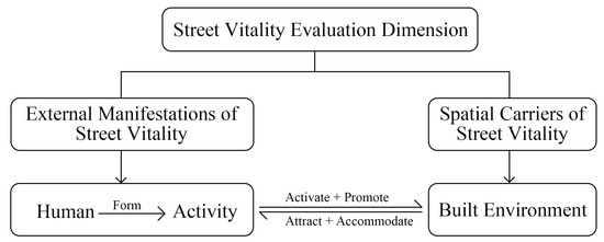This study is rooted in the development of the evaluation dimensions and criteria for street vitality. Given that vitality is a complex and abstract concept, it must be translated into specific features that can be effectively observed and analyzed. The indicator system employed in this study was based on the existing street vitality indicator system and was screened accordingly. Through a subject–object analysis of the composition and elements of street vitality, the built environment of the street is regarded as the spatial carrier of vitality, while the dynamic activity behavior of humans serves as an external characterization of street vitality. These two factors are interdependent and mutually causal, as shown in Figure 4.
