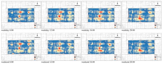 In terms of the temporal distribution, the overall spatial vigor was lower on weekdays than on days off, and pedestrians in blocks under different periods had different spatial distribution patterns, as shown in Figure 6. On weekdays, spatial vitality surged from 6:00 to 8:00, followed by an early peak, gradually decreased during the lunch break from 12:00 to 15:00, and then showed a late peak after 16:00 and continued until 18:00, after which spatial vitality continued to decline. The spatial vitality on rest days grew faster from 6:00 to 10:00, lasted longer than that on weekdays, had a gradual upward trend, and peaked at 13:00–15:00, with heat beginning to decline after 18:00 and spatial vitality plummeting after 22:00.