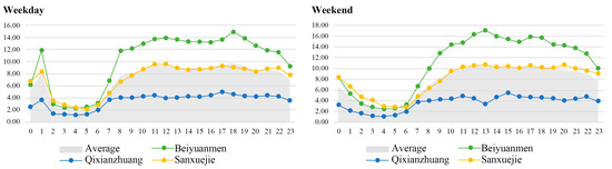 In terms of spatial distribution, the spatial vitality of the Beiyuanmen Historic District was high in the east and low in the west, with large differences in vitality values. The vitality values around Beidajie and the bell tower were higher, and those in areas with subway stations, hospitals, and schools were also higher, whereas the residential-oriented areas had lower vitality values, and there were no obvious fluctuations on weekdays and weekends. The spatial vitality of the Sanxuejie Historic District showed a spatial vitality distribution of high in the north and low in the south, high in the west, and low in the east, with little difference in vitality values. East Street, the bell tower area, and Yongningmen had relatively high vitality values. Among the three districts, the vitality value of the Qixianzhuang Historic District was generally low and unaffected by holiday factors. After field research, the Qixianzhuang Historic District was dominated by traditional communities and buildings, which are the living places of the aborigines. From a comprehensive point of view, the scope of human activities in the three districts is relatively fixed and is mainly concentrated in offices, shopping places, and scenic spots. The distribution of crowded places on weekends is more extensive, with no obvious fluctuations in the heat values on weekdays and rest days, and the heat values on weekends were greater than those on weekdays, as shown in Figure 5.