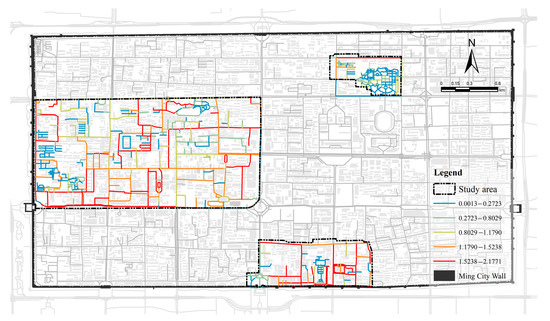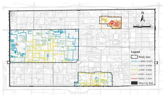 According to the line segment model analysis of spatial syntax, the walking accessibility of Qixianzhuang District was the highest, followed by that of Sanxuejie, and the walking accessibility of Beiyuanmen was the lowest, as shown in Figure 7.