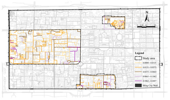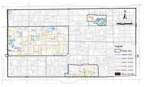 The functional density is affected by the functional layout of the district, which has different characteristics. As shown in Figure 8, the Beiyuanmen and Sanxuejie Historic and Cultural Districts have a greater density of facilities overall. Beiyuanmen District is a large-scale living neighborhood dotted with scenic spots and ancient monuments. Its facilities are mainly concentrated in the southern part of the center of the district, and the areas with lower functional density are mainly small streets and alleys within the residential area. Sanxuejie District mainly consists of buildings of cultural relic protection units; therefore, the streets with higher functional density are those outside the buildings of cultural relic protection units. The Revolutionary Park on the southeast side of Qixianzhuang District occupies most of the area, and the former office site is on the northwest side, so the overall functional density is lower. However, the north side is one of the main living streets within the city wall, so the functional density is greater.