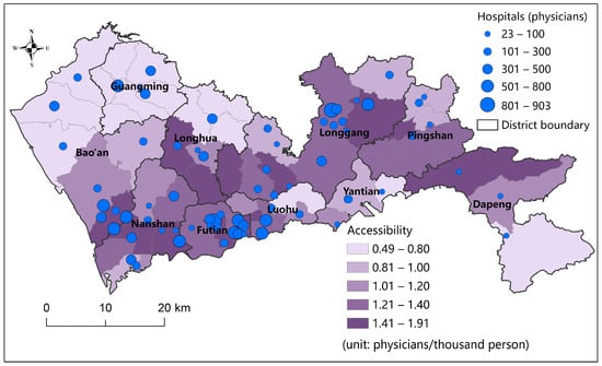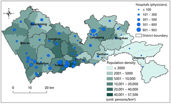 Second, the healthcare facility data were collected from the official website of the Health Commissions of Shenzhen Municipality [52]. In total, 71 public general hospitals were included in our analyses. Their information, including their names, addresses, and numbers of physicians, was collected in July 2021. The geographical coordinates of these facilities were then obtained using the Geocoding Application Programming Interface (API) of Baidu Maps. The distributions of the population density and healthcare facilities are shown in Figure 1.