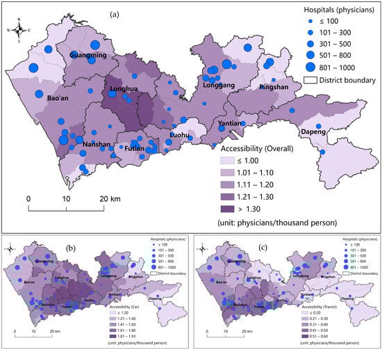 When applying the multimodal 2SFCA model, a key step is to set up the catchment area size of the facilities (), which reflects the maximum travel time that people are willing to travel to access a hospital. According to the estimated travel time data, the shortest travel times to the nearest facilities by the car and public transit modes were first calculated (about 50 and 90 min, respectively). Following the procedure for determining the catchment area size in existing studies [26,45], to ensure that all demanders can reach at least one healthcare facility within this threshold via either transport mode, and were both set as 90 min. Note that although equals , the distance that can be reached is different for the two modes. Generally, the average travel speed by car is faster than that by public transit. Therefore, more hospitals can be accessed within the 90 min catchment area from a given location by car than by public transit, but the accessibility to these hospitals would be more significantly discounted by the distance decay effect. This unified setting can reflect the advantages of the car mode against the public transit mode, but also significantly simplify the modeling.
