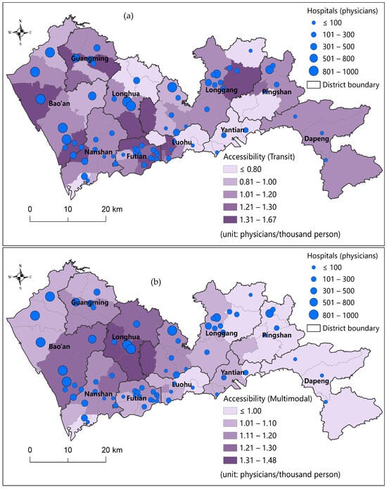 The distribution of (a) the transit-modal accessibility and (b) the multimodal accessibility based on optimal healthcare facility sizes by the single transit-modal transit MAE.