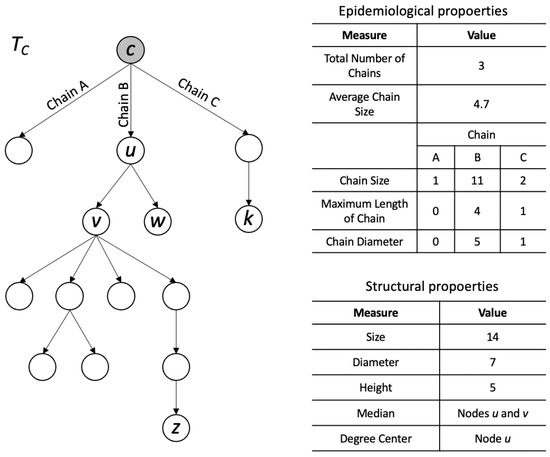 In graph theory, an epidemic tree rooted at node , where V is the set of nodes (infection cases) and E is the set of edges, is a directed rooted tree that allows understanding disease spread by its hidden structural properties [32]. The root of the tree c represents a primary case in the infection process.
