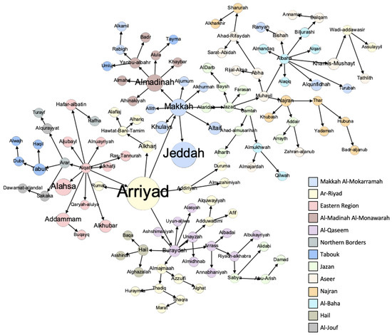 COVID-19 city transmission network between in Saudi Arabia. Nodes are partitioned according to their administrative regions. Node sizes are proportional to their populations.