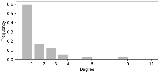 The network (epidemic forest) has 119 nodes and 118 edges (single connected component). The epidemic forest consists of 20 epidemic trees, each rooted at a central node. In total, 71% of edges connect cities that belong to the same administrative region. The maximum, minimum, and average outdegrees over all nodes are 11, 0, and 1, respectively. Figure 3 shows the degree distribution of all nodes. The degree distribution depicted in Figure 3 highlights a skewed pattern, with most nodes having a low outdegree and a few nodes exhibiting higher connectivity. This heterogeneity indicates that certain cities play disproportionately influential roles in disease transmission, acting as hubs in the network. Irrespective of edge directions, the average path length between nodes is three, and the network diameter is eight.