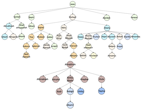 Figure 4 show two epidemic trees rooted at central nodes Jazan () and Almadinah (), respectively. The different nodes are colored according to the administrative regions they belong to. The figure shows that both central nodes have caused disease transmission within and outside of their administrative regions (Jazan spread the disease to five other regions and Almadinah to two other regions). Both trees have the same Total Number of Chains. However, the Average Chain Size of is larger than that of .