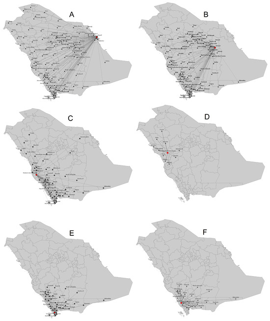 Geographic coverages of six epidemic trees: (A) , (B) , (C) , (D) , (E) , and (F) . The red dots indicate the root cities of the respective epidemic trees.