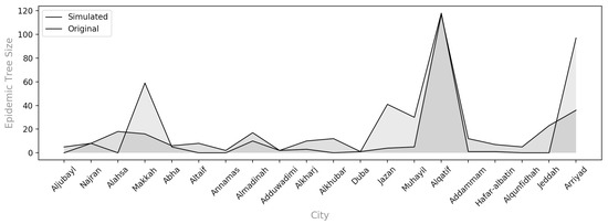 The second set of measures examines the structural properties of the epidemic trees rooted at each central node. Those measures provide insights about the between-city transmission events. Seven measures were considered for each epidemic tree: Size, Diameter, Height, Median, Degree Center, and Temporal and Spatial Information. The Size property indicates the total number of infections arising from each infected central node. Table 2 shows that the epidemic trees rooted at Alqatif, Arriyad, and Makkah resulted in larger infection sizes compared to the other epidemic trees. The three trees also have the largest diameters and heights, indicating their significant role in the disease spread. The Diameters of each of , , and are 13, 10, and 13, respectively. The Heights of , , and are 8, 6, and 7, respectively.