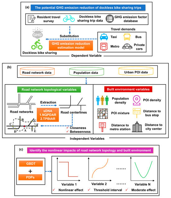 Research framework. (a) Estimating the potential GHG emission reduction of DBS trips which is utilized as dependent variable; (b) Extracting the independent variables, including road network topological variables and built environment variables; (c) Identifying the nonlinear impacts of road network topology and built environment on the potential GHG emission reduction of DBS trips.