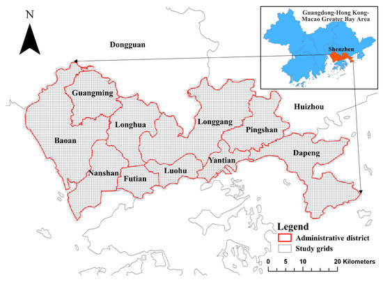 Shenzhen is one of the four economically developed first-tier cities in China and the central hub of the Guangdong–Hong Kong–Macau Greater Bay Area. In 2016, a DBS operation mode based on the Internet was introduced to Shenzhen. At present, Shenzhen has developed a well-established DBS system. Moreover, Shenzhen shares similar characteristics with many other cities in China in terms of planning and operating strategies for DBS. Therefore, we selected the administrative district of Shenzhen as the study area (Figure 2). According to previous studies [79,81], grid cells of 500 m × 500 m were determined as the units of analysis in this study. After removing grids without DBS trips, we attained 4260 grids for further analysis.